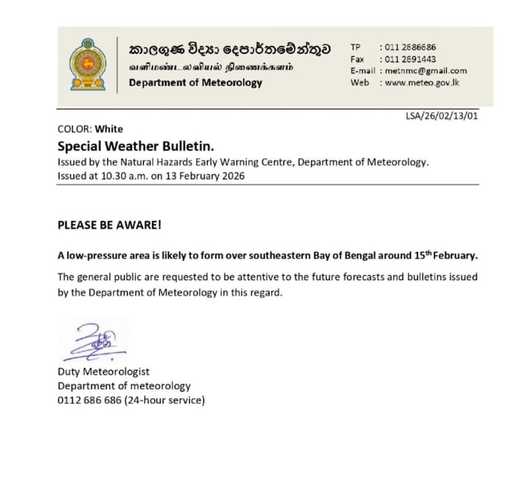 Sri Lanka's Natural Hazards Early Warning Center has said that low pressure is likely to form in the southeastern Bay of Bengal around February 15. It is not clear yet how much direct impact it will have on Colombo, but as a precaution everyone is on alert mode. There has been a pattern of rain in Colombo in the afternoons in the last few days, so the concern is justified.